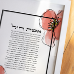 This modern artwork combines timeless tradition with contemporary elegance. Soft watercolor poppy flowers frame the Hebrew text, bringing warmth, color, and meaning to any space. Perfect for displaying in the home, gifting for weddings, anniversaries, housewarmings, or as a thoughtful tribute to the remarkable women in your life.
