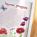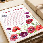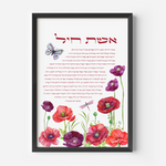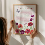 This modern artwork combines timeless tradition with contemporary elegance. The colorful butterfly and flowers surrounding the Hebrew text, brings warmth, color, and meaning to any space. Perfect for displaying in the home, gifting for weddings, anniversaries, housewarmings, or as a thoughtful tribute to the remarkable women in your life.