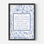 Proverbs 31:25 Wall Art - "She is clothed with strength and dignity and she laughs without fear of the future" featuring a gorgeous blue and white flowers background.