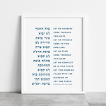 A framed wall art with Hebrew text, featuring a modern minimalistic design, with a white background and blue typographic elements.
