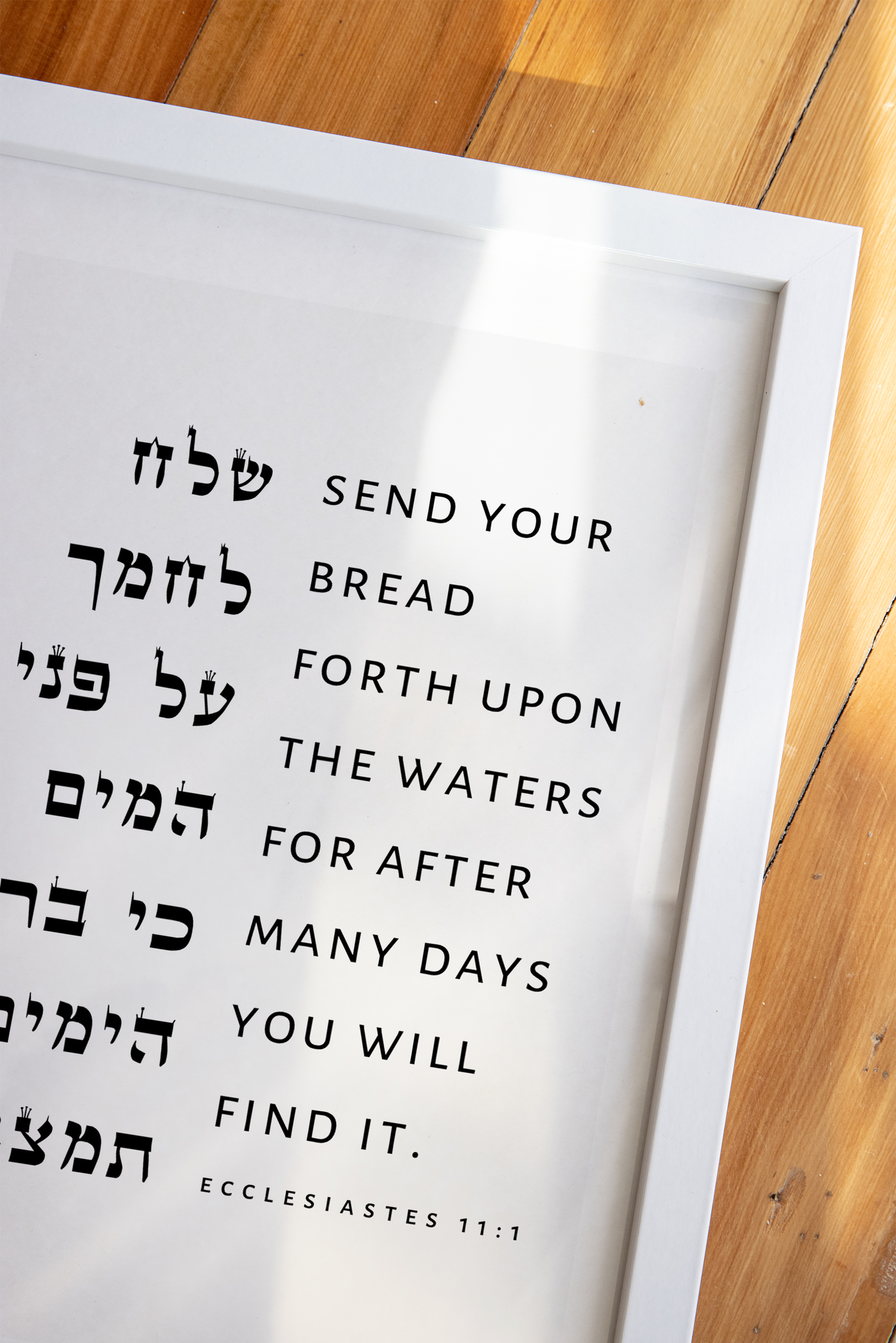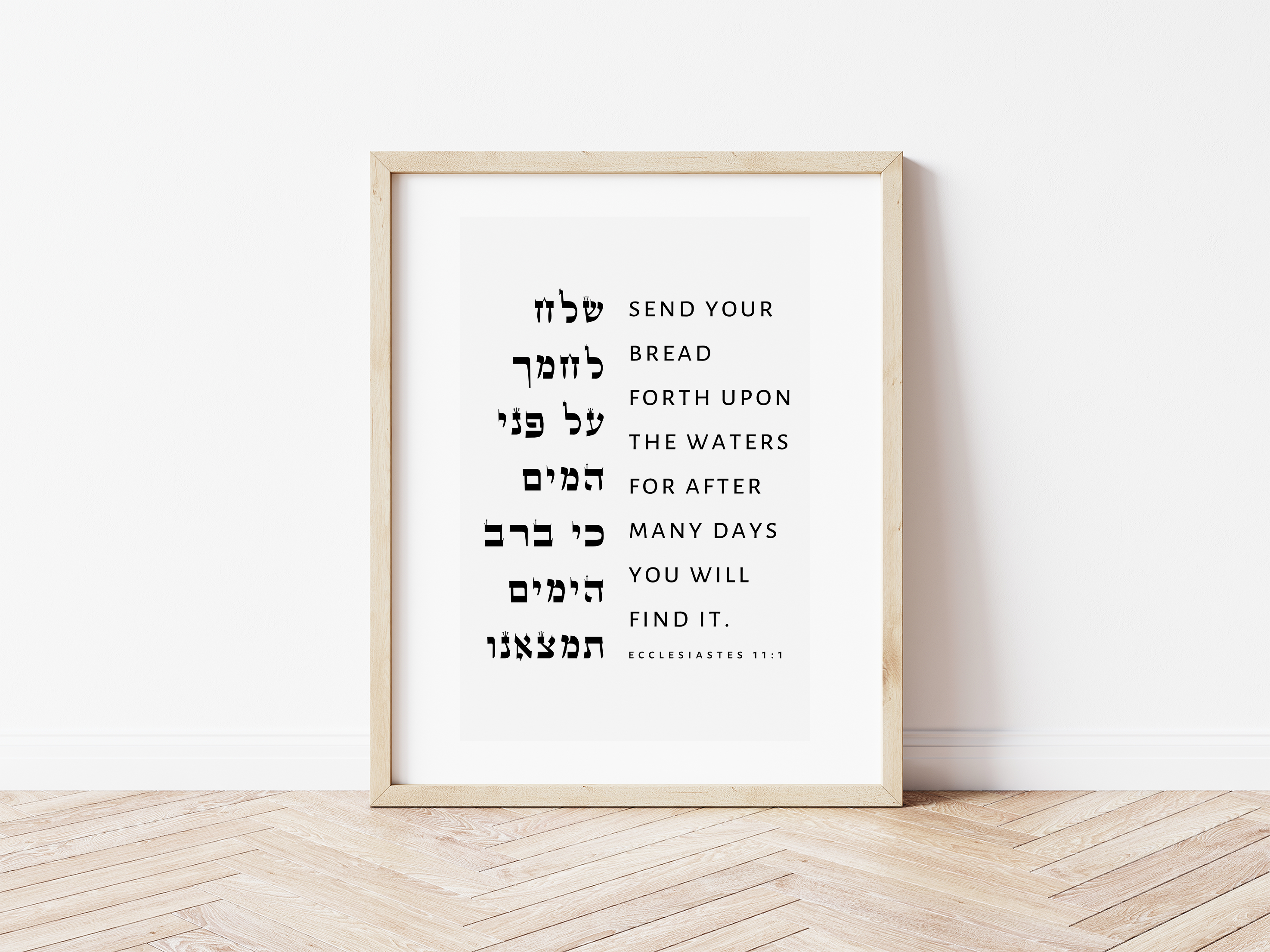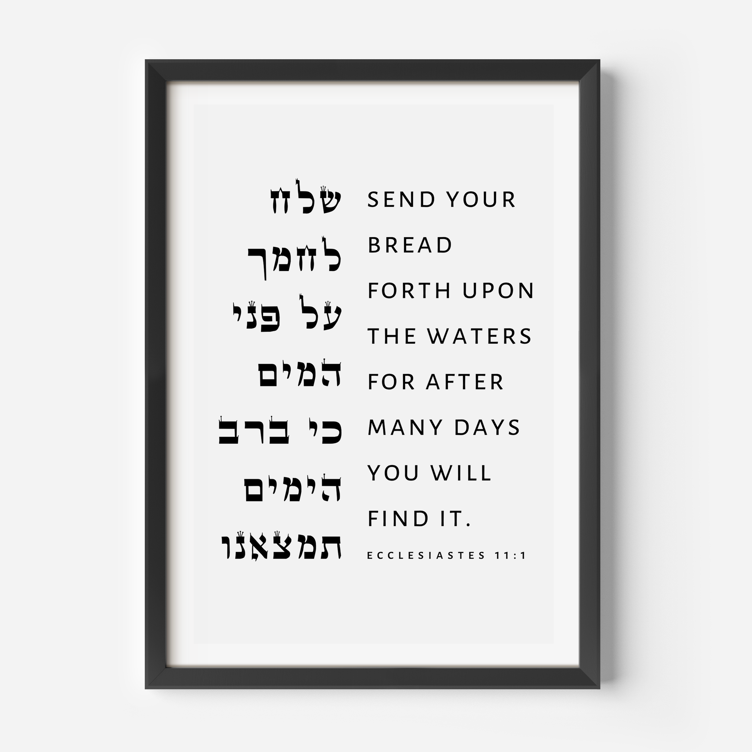 Add depth and meaning to your office / business space with this elegant minimalist print featuring the timeless wisdom of Ecclesiastes 11:1 in both Hebrew and English.